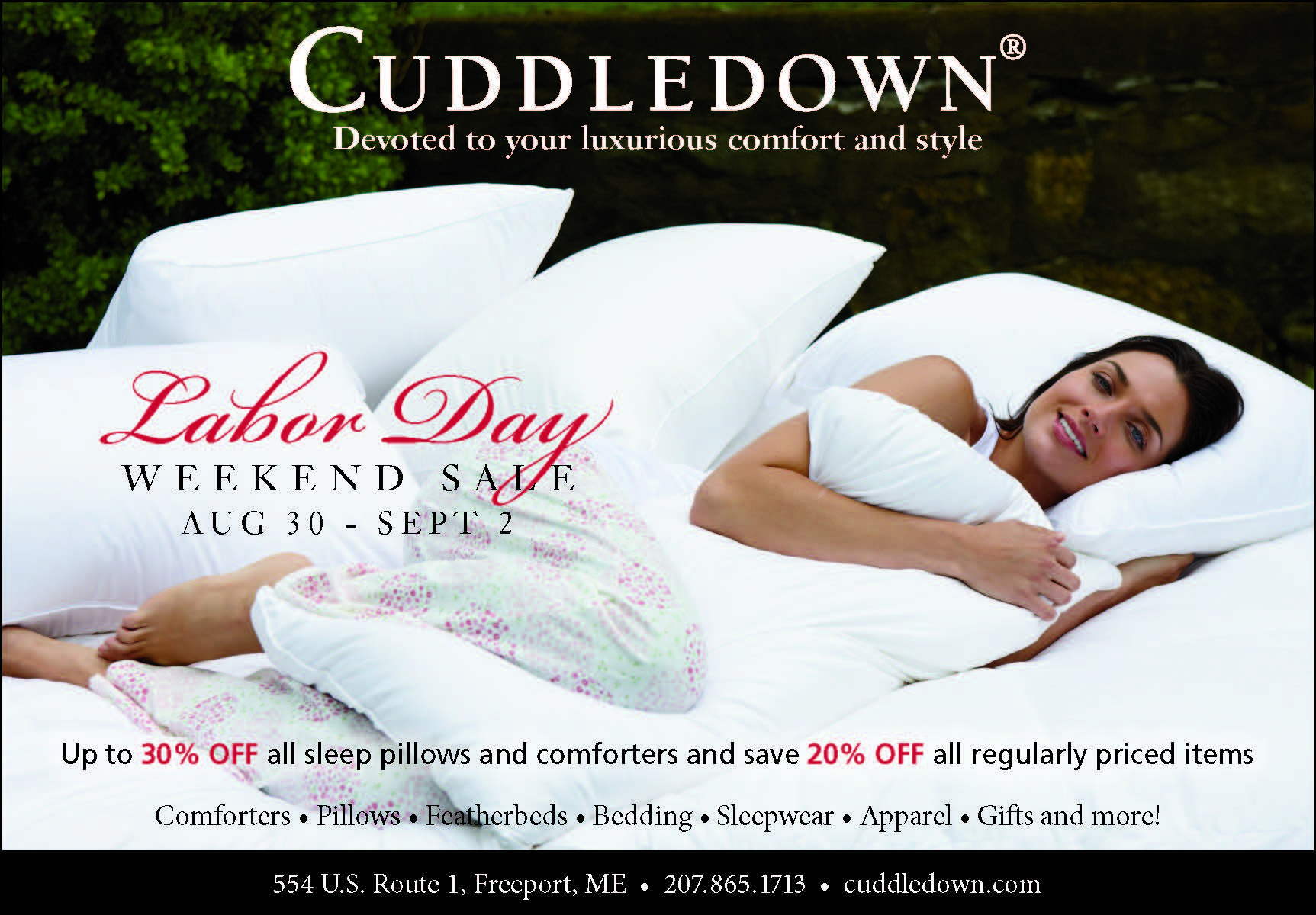 Today through Monday, September 2nd, save on comforters and pillows at our store in Freeport, Maine! All sleep pillows are up to 30% off, and all regularly priced comforters are 20% off. Plus, all other regularly priced items are 20% off! Enjoy great outlet savings on our selection of sleepwear, comfortable apparel, slippers, gifts and more. We hope to see you in Freeport this weekend, and have a wonderful Labor Day!