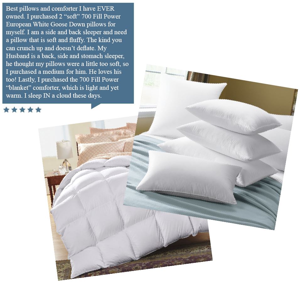 Our lovely customer from Des Moines, Iowa uses our 700 Fill Power European White Goose Down products to create a cloud-like haven in her home. All of our down products also happen to be made right here in the USA! Here’s what she had to say about our 700 Fill Power European White Goose Down Pillow and 700 Fill Power Sateen Down Comforter: